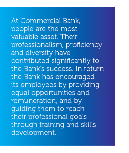 At Commercial Bank, people are our most valuable asset. Their professionalism, proficiency and diversity have contributed significantly to our success. We have in turn encouraged our employees by providing equal opportunities and remuneration, and by guiding them to reach their professional goals through training and skills development. We also strive to help our people achieve work-life balance. While staff relations are governed by the Shop and Office Employees Act, the Bank goes beyond these regulations in what we offer employees. Their welfare, progress and contentment are among our core priorities. We believe strongly that an effective collective bargaining process, covering employee compensation and human rights concerns, helps foster strong bonds with trade unions and the executive association, which in turn ensures the long-term viability of the Bank’s operations.