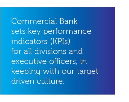 Commercial Bank sets key performance indicators (KPIs) for all divisions and executive officers, in keeping with our target-driven culture. These KPIs enable us to measure the contributions of each business division and individual employee as we pursue the objectives of economic, environment and social policies. We reinforce the achievement of targets through effective action plans and resource-allocation mechanisms, linking various functions to the Bank’s overall strategy, as dictated by our vision and mission. The numerous awards and accolades Commercial Bank has earned in the areas of economic, environment and social sustainability speak to the effectiveness of our approach. A summary of this third-party recognition appears under Awards and Accolades.