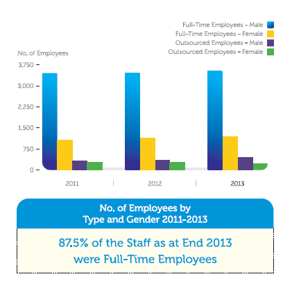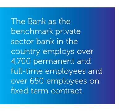 The Bank as the benchmark private sector bank in the country employs over 4,700 permanent and full-time employees and over 650 employees on fixed term contract. As a policy, the Bank does not recruit employees on part-time basis. The Bank recognising the importance of its human resource capital makes every endeavour to support and uplift its standard by promoting a sound work environment, equal opportunity, training and skills development, freedom of association and to protect their human rights. A summary of total number of employees by employment contract, region and gender are given below.
