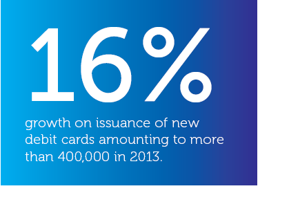 Strengthening our position as the market leader in debit cards, Commercial Bank issued more than 400,000 new cards in 2013 - a growth of over 16% compared to the previous year, achieving a record total of more than three million cards in use. This contributed to a growth exceeding 30% in debit card purchases which resulted in substantial increase in interchange income compared to 2012.