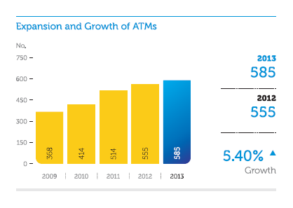 Last year, we added two new card products to our well-diversified portfolio: the Udara card and the Achievers card. At the same time, we began enrolling credit and debit cardholders for SMS alerts. In 2013, we entered into agreements with two finance companies and a bank to issue ATM and debit cards. Our Goldnet ATM switch also provides a gateway to international and local transactions through other networks such as Visa International.