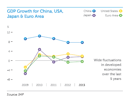 The United States, the traditional driver of the world economy, experienced modest growth over the past year, fuelled by solid private demand. While Japan’s economy has seen a vigorous rebound, its growth is expected to slowdown in 2014 by the country’s tightened fiscal policy. In Europe, the member states of the Euro area have begun to climb out of recession, but while the threat of a contraction is declining, the overall economic forecast is tepid.
