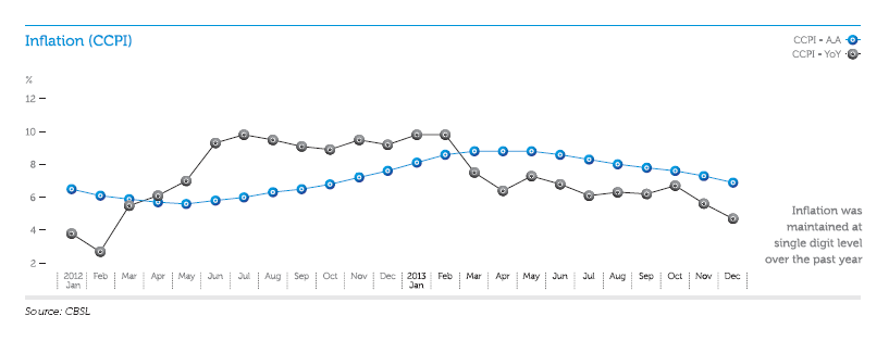 Inflation as measured by the Colombo Consumers’ Price Index (CCPI) declined during 2013. Softer international commodity prices and improved domestic supply helped to contain the rate of inflation.