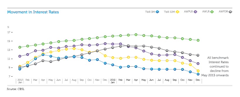 Overall, there was downward movement in Treasury yield rates, as well as lending and deposit rates of major commercial banks. The prime lending rate declined from a peak of 14.4% in early March 2013 to 9.88% by the end of December - a reduction of 452 basis points.