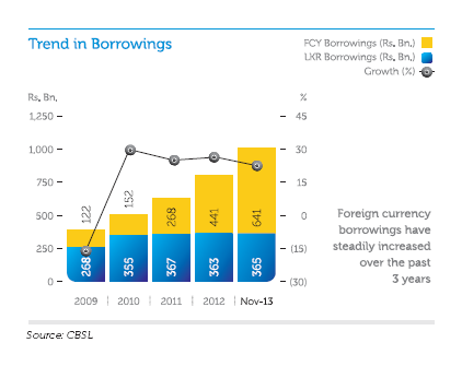 On the strength of its balance sheets, the banking sector raised US $ 1,548.3 Mn. in 2013 through foreign borrowings, compared to US $ 973 Mn. raised in the year before.